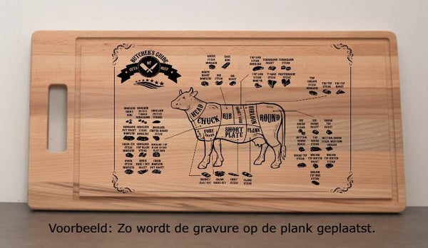 Voor de échte grillmaster of vleesliefhebber: deze houten snijplank met gegraveerde vleeskoe is dé perfecte combinatie van praktisch én stijlvol. De gravure toont op overzichtelijke wijze de verschillende vleesdelen van een koe – ideaal als decoratief item én als stevige plank voor het snijden van vlees tijdens een barbecue.
