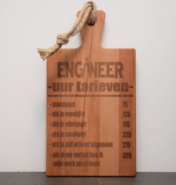 Zoek je een cadeau voor een engineer die alles al heeft, behalve een flinke dosis humor op de borreltafel? Deze borrelplank is gegarandeerd een schot in de roos.